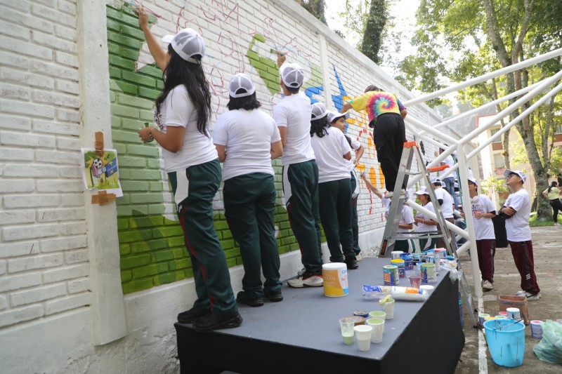 Alumnas y alumnos del COBAEV participaron en brigadas para la limpieza de áreas verdes, rehabilitación de canchas, actividades recreativas y la intervención de un mural, con el acompañamiento de la muralista Itzel Velasco Pérez, Invierno Azabache.