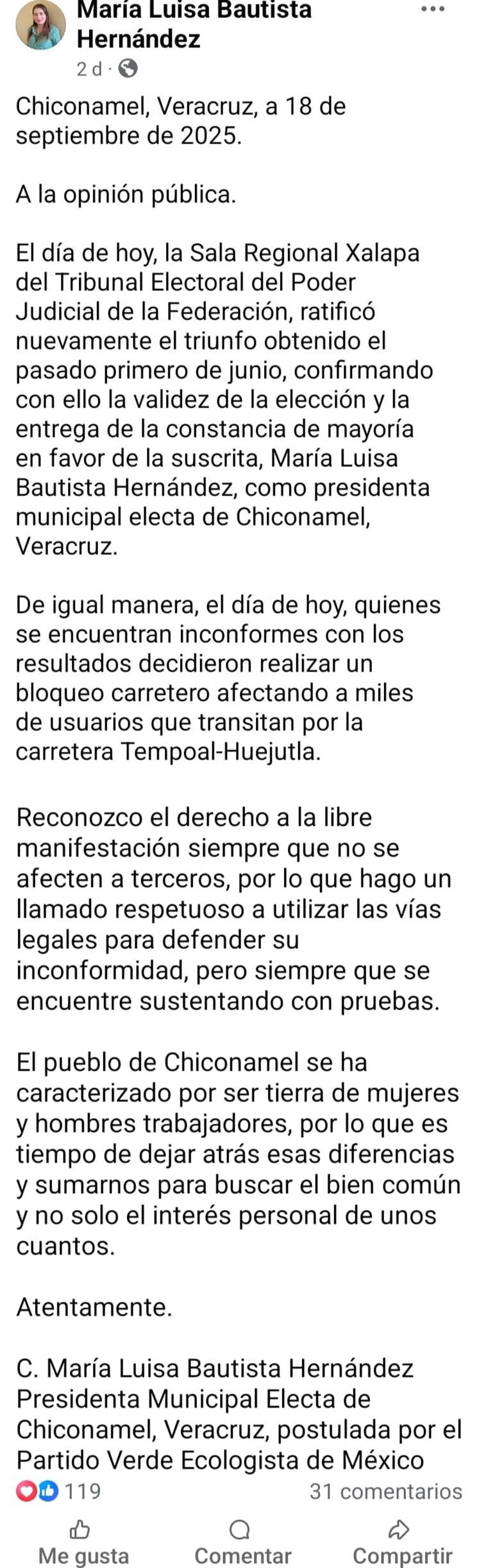 Al respecto, la presidente municipal electa de Chiconamel, María Luisa Bautista Hernández, a través de sus redes sociales, hizo un llamado respetuoso a los inconformes a utilizar las vías legales para defender su inconformidad, pero siempre que se encuentre sustentando con pruebas.