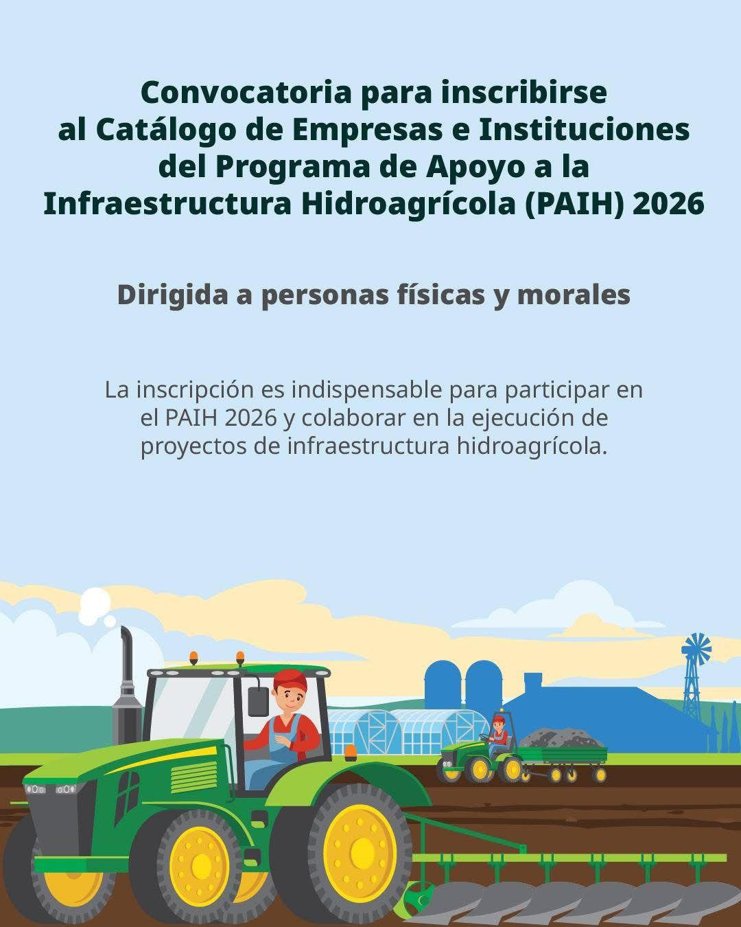 XALAPA, Ver., marzo de 2026.- La Comisión Nacional del Agua (Conagua) convoca a empresas, instituciones académicas y organizaciones de Veracruz, interesadas en sumarse o registrarse en el Catálogo de Empresas e Instituciones para la Ejecución del Programa de Apoyo a la Infraestructura Hidroagrícola (PAIH) 2026.